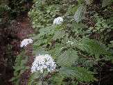 | 道がせまくなると、しばらくヒノキの植林の道となります。 坂も段々きつくなります。 そんな山道に、コアジサイの白い花がたくさん咲いていました。 里でよく見られるあじさいの、野生種です。 地味ですが、薄暗い林に彩りを与えています。 |