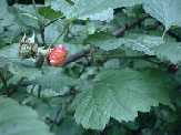 | またこの時期には、木いちごがいたるところに見られます。 まだ赤く色づいた実はわずかで、その実も まだすっぱいです。 もうすこしたつと、赤い実がいっぱいなり、 おいしいいちごが食べられます。 |
