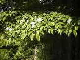 | 今度は山頂から妻坂峠に向かいます。 この道も、時折植林地帯が見られますが、 雑木林の楽しい道です。 6月のこの時期は、白い花が多く見られます。 写真は、大きな白い花を広げる、ヤマボウシという花です。 このほか、白い花を枝にいっぱい吊り下げる、 ハクウンボクという木の花も見られました。 |