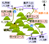 桜ヶ谷コースにはトイレが、野巻林道コースには水場(バンダガ沢水場)があります。