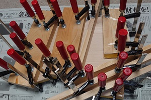 家にあった太めの角材を適当な長さにカットして、ボディ全面がしっかりと接着されるように角材を介してメイプル板を押さえ付けるようにクランプで締め付け ました。