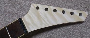 本当に偶然ですが、このネックはバインディングが入ってるのでボディとのマッチングがいいんですよね。ただ、ヘッドにはバインディングが無いので、塗装でそれらしく見せようと企ててます。