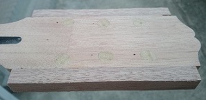 実はその前にペグ穴を埋める作業を行ったのですが、うっかり写真を撮るのを忘れてしまったので、ここで文字だけで簡単に説明すると、直径約11mmのペグ穴に12mmのドリルビットをネジ込んで穴の内部の塗装を削り落とし、そこに円柱形のラミン材にタイトボンドを塗って差し込んで接着して、ボンド乾燥後に飛び出たラミン材をノコギリでラフカットしました。
