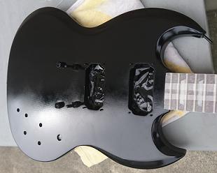 今まで何回か偏光カラーの塗装を繰り返してみて、微風の時に風下にギターを立てて置き、50cmくらい離れたところからスプレーのミストを風に乗せるように吹くのがムラにならないコツのひとつだと発見しました。