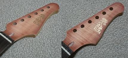 画像は、表面の塗装を落として突き板を貼り、トラ杢を目立たせるためのステインを薄く塗り込んだところです。このヘッドの形状は気に入ってるので変えません。メイビスがメジャーかマイナーかは分かりませんが、ギターそのものはメイビスを連想できないくらいまで変えたので、後々も比較される事は無いだろうと思ってます。