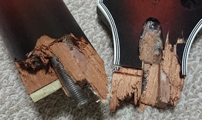 サンディングして色が落ちた途端に、入手時のネック折れ修理の補強材が目立ちます。