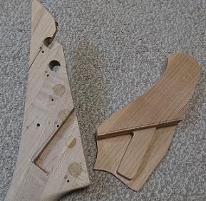 新しく追加される部分はもちろん、補強材を埋め込み(ステンレス製のステーを埋め込む事も考えたけど、ヘッドが不必要に重くなるので却下)、見た目も考慮して突き板を貼って、などと思案していたのですが、だったらそれ全部1枚の板から削り出したらどうよ??って結論に至り、結果として画像のような物ができあがりました。