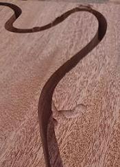 で、ブックマッチの2枚を1枚に貼り合わせるのに物凄く苦労しました。と言うのも、2枚とも思いっ切り反っていたからです。それらを強制的に真っ直ぐに伸ばしつつ、断面が完璧に密着するように完全な垂直でストレートに加工して貼り合わせるのは、何の設備も持たない素人には超弩級に困難な作業でした。