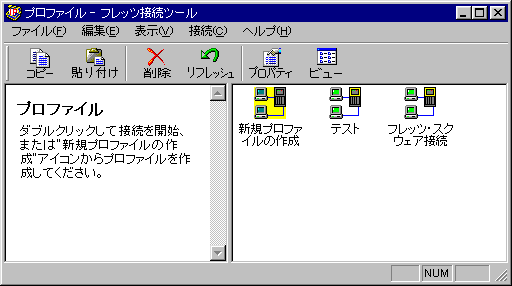 「フレッツ接続ツール」画面では、接続プロファイルの作成やプロファイルからの接続、また各プロファイルの設定情報を確認できます。