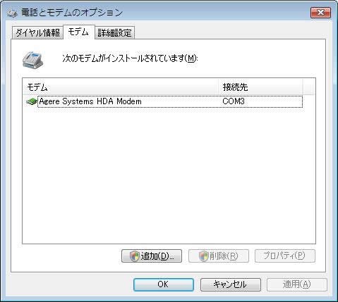 (5)「電話とモデムのオプション」 画面で 「モデム」 タブを選択し、お使いのモデム・またはTA等の名前が表示されていることを確認します。「OK」 をクリックします。