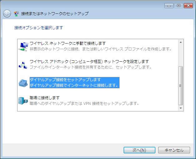 「ダイヤルアップ接続をセットアップします」 を選択し、 「次へ」 をクリックします。