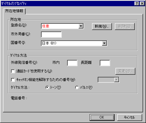 (3)「所在地」に任意の名前を入力します。「国/地域番号」は日本を選択します。「市外局番」を入力します。