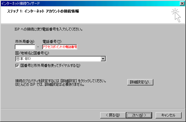 (3)「電話番号」にはアクセスポイントの電話番号を入力します。