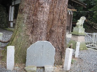 樹齢約700年、樹高約40mの大杉。 神社の鳥居から見上げると、天を突くようにそびえたち圧倒される。 根回り約9mの根付近には、句碑もある。