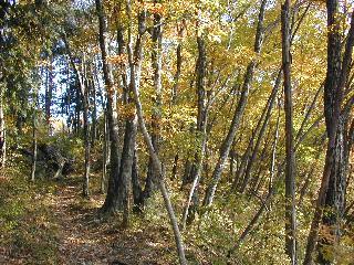 山頂付近の雑木林の登山道は、晩秋の頃は黄金に色づきます。