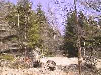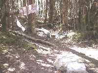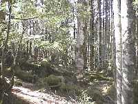 | ササヤブは、標高1600m付近がもっともひどくなっています。 それでも、尾根沿いに登れば、ときおり目印の赤いテープがあるので、 不安になることはありません。 1762mを過ぎるあたりから、道もはっきりしてきて、 再び快適な道が始まります。 このあたりは、30年ほど前に大規模な山火事があったところ。 今では、火事で焼けた大木の株もコケに覆われ、 荒れ地にいち早く根づいたダケカンバの木が立派に育っていました。 |