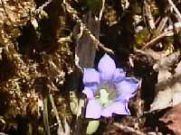 | 西側斜面の道に飽きてきたころ、 足元にリンドウの花が咲いているのを発見しました。 それにしても、リンドウは秋に咲く花だったような。。? そういえば、途中、茶色いかわいいきのこも生えていました。 秋のころは、もっとたくさんリンドウやきのこが生えて 楽しい道となるのでしょう。 |