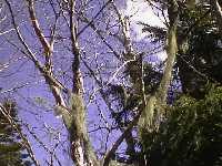 | 木には、サルオガセと呼ばれる地衣(ちい)植物が垂れ下がっていました。 このサルオガセは長さ1mを越えるほどに成長していました。 サルオガセは空気中の水蒸気を吸って生きているので、 空気がきれいな場所にしか生きることができません。 抜けるような青空をバックに、サルオガセが風にたなびいていました。 |