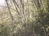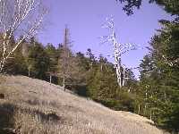 | しばらく歩くと、奥秩父主稜線からの”まともな道”と合流します。 合流地点からは、植林されて放棄されたようなカラマツの林の斜面を登ります。 そして、山頂へは、東に向かいます。 途中、山火事の跡とみられる、「千代蔵の休ン場」という 荒涼とした草原を抜けます。 その先も、小さな草原(写真)がところどころあって、 焼け残った原生林と相成って、 山上の楽園といった感じです。 |