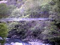 | 埼玉の独立峰の最高峰である和名倉山は、標高2036m、 奥秩父の前衛としての位置に、どっしりとした姿を横たえています。 しかし埼玉側からの登山道は、現在深いやぶに包まれています。 そんなわけで、登る人が少なく、秘峰の雰囲気を漂わせています。 そんな和名倉山に、川又から入山してみました。 川又のバス停から荒川におりたところに、吊り橋があります。 和名倉山探検の入口です。 |